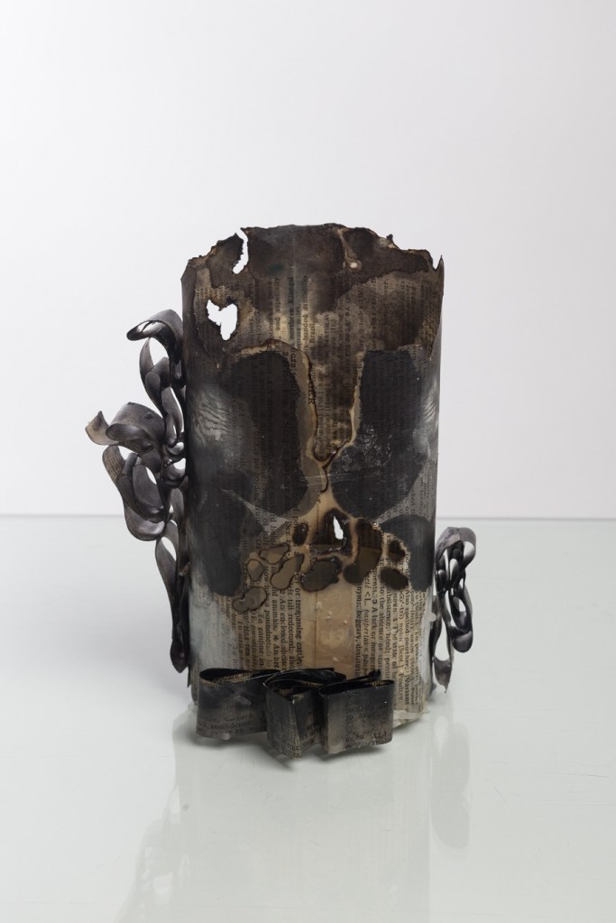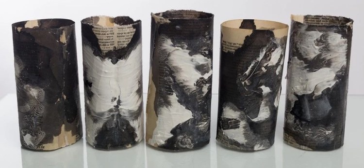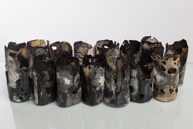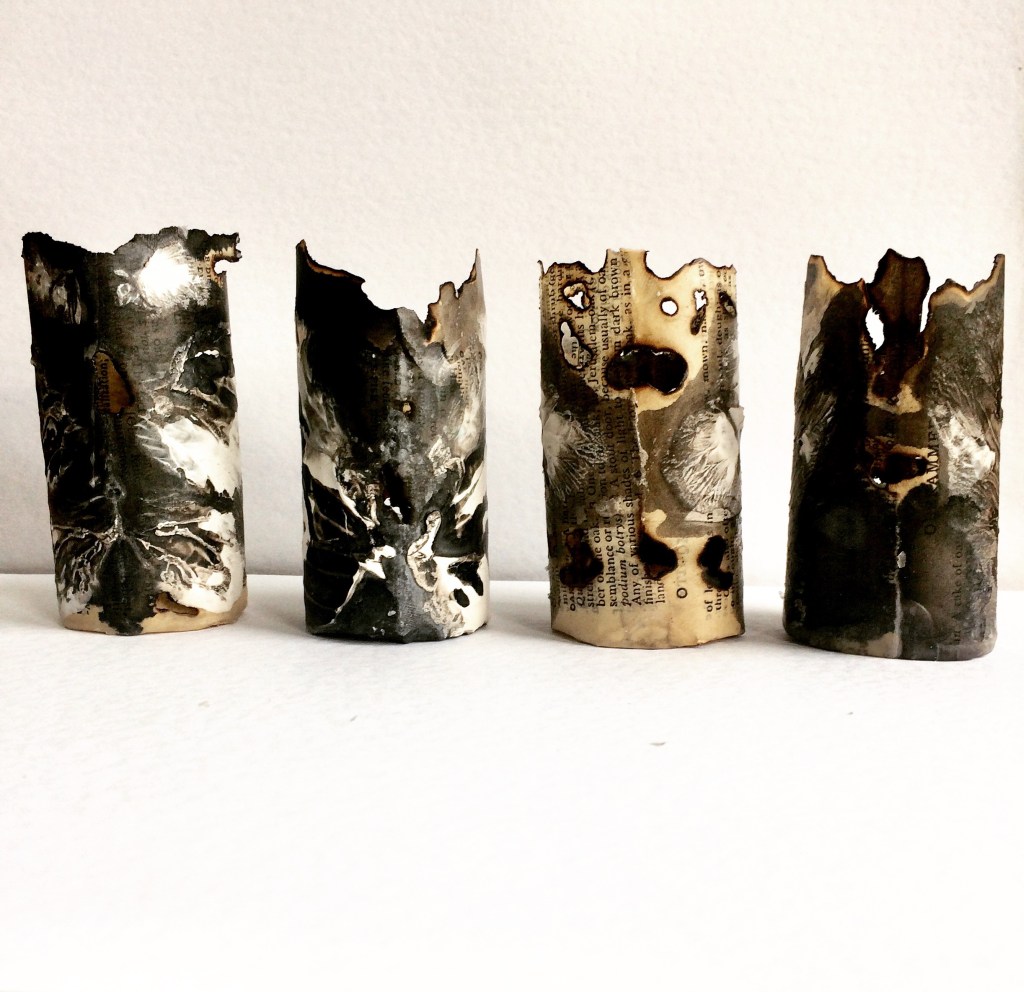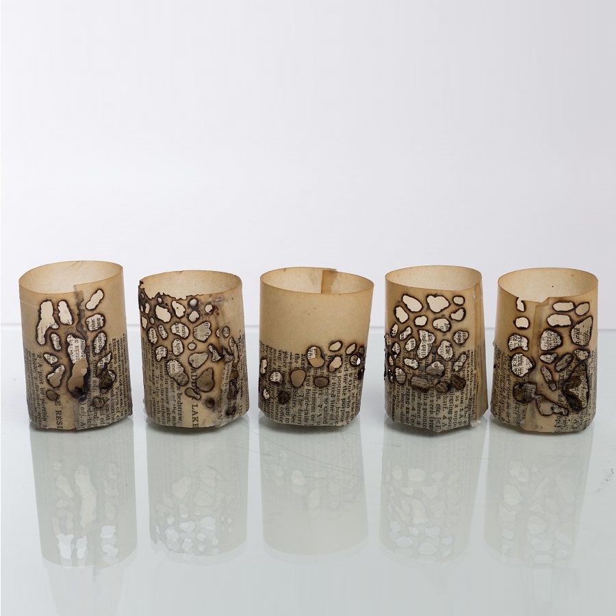 Kate Bufton creates intricate and fragile paper sculptures from pages of timeworn books. Delicately assembled paper vessels enhance the books’ original beauty, whilst absent words – either stained or removed – highlight the damaging consequences of removing public libraries from our communities.